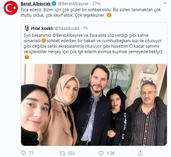 Bakan Albayrak, takipçisinin paylaştığı fotoğrafı retweet ederek o buluşmayı duyurdu. Albayrak sosyal medya hesabı üzerinden yaptığı paylaşımda, "Rica ederiz. Bizim için çok güzel bir sohbet oldu. Biz sizleri tanımaktan çok mutlu olduk, çok keyif aldık. Çok teşekkürler." ifadelerini kullandı.