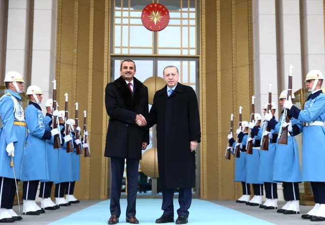 Cumhurbaşkanı Erdoğan, çalışma ziyareti için Türkiye'de bulunan Emir Al Sani'yi Cumhurbaşkanlığı Külliyesi'nin kapısında karşıladı.