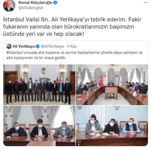 CHP Genel Başkanı Kemal Kılıçdaroğlu, Vali Yerlikaya’nın paylaşımını alıntılayarak Vali Yerlika’yı tebrik etti. Kılıçdaroğlu, Vali Yerlikaya'nın paylaşımına, "İstanbul Valisi Sayın Ali Yerlikaya'yı tebrik ederim. Fakir fukaranın yanında olan bürokratlarımızın başımızın üstünde yeri var ve hep olacak!" ifadelerini kullandı.