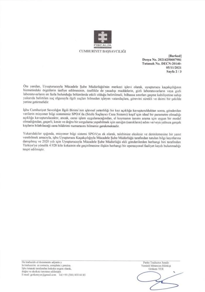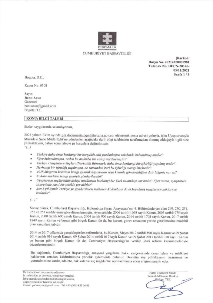 Kolombiya’nın Buenaventura Limanı’nda Türkiye’ye gönderileceği iddia edilen 4 ton 900 kilogram uyuşturucunun ele geçirilmesiyle ilgili, İçişleri Bakanlığı Emniyet Genel Müdürlüğü resmi internet sitesinden yapılan yazılı açıklamada, “Adalet Bakanlığımız üzerinden Kolombiya’ya iletilen adli istinabe talebine, Kolombiya adli makamları tarafından bugüne kadar herhangi bir cevap verilmemiştir. Ayrıca Kolombiya adli makamlarının Adalet Bakanlığımızdan herhangi bir adli yardımlaşma talebi olmamıştır. Kolombiya narkotik biriminden alındığı söylenen İspanyolca belgede, 22/09/2021 tarihinde Türkiye’ye adli istinabe talebinde bulunulduğuna ilişkin bir ifade yer almamaktadır. Belgenin resmi tercümesi açıklamamız ekindedir.” ifadelerine yer verildi.