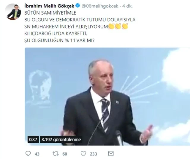 Gökçek İnce içinde "Bütün samimiyetimle Muharrem İnce'yi alkışlıyorum" dedi