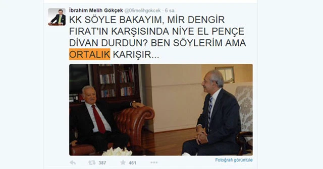 Ankara Büyükşehir Belediye Başkanı Melih Gökçek Twitter hesabı üzerinden HDP meclis başkan adayı Dengir Mir Mehmet Fırat’ın CHP lideri Kemal Kılıçdaroğlu ile çekilmiş fotoğrafını paylaşarak sert eleştirilerde bulundu.