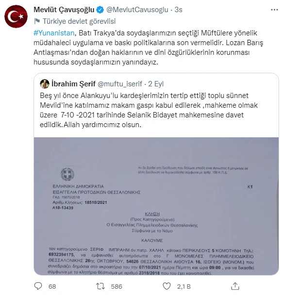 Dışişleri Bakanı Mevlüt Çavuşoğlu, Twitter hesabından Batı Trakya Türk Azınlığı Danışma Kurulu Başkanı ve Gümülcine seçilmiş müftüsü İbrahim Şerif'in Twitter'da yaptığı, "5 yıl önce Alankuyulu kardeşlerimizin tertip ettiği toplu sünnet mevlidine katılmamız makam gaspı kabul edilerek, mahkeme olmak üzere 7 Ekim'de Selanik Bidayet Mahkemesine davet edildik. Allah yardımcımız olsun." paylaşımını alıntıladı.