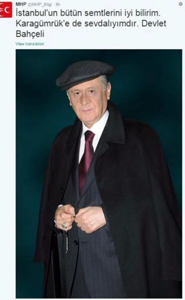 MHP'nin Twitter hesabından Bahçeli'nin kasket, palto ve tesbihli fotoğrafı paylaşılarak “İstanbul’un bütün semtlerini iyi bilirim, Karagümrük’e de sevdalıyımdır. Devlet Bahçeli” notu düşülmüştü.