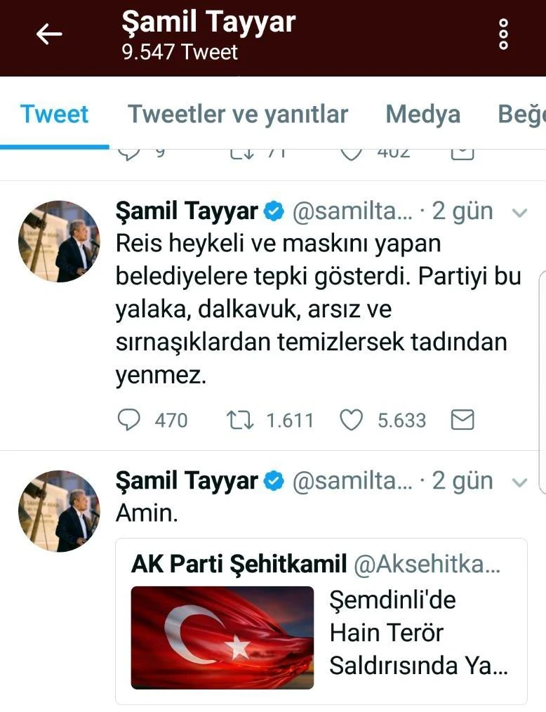 Milletvekili Tayyar, sosyal medya hesabından yaptığı paylaşımda, "Reis heykelini ve maskını yapan belediyelere tepki gösterdi. Partiyi bu yalaka, dalkavuk, arsız ve sırnaşıklardan temizlersek tadından yenmez" paylaşımı yaptı.