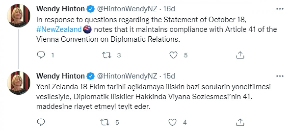 Almanya ve Fransa'nın Ankara büyükelçilikleri de ABD Büyükelçiliğinin Diplomatik İlişkiler Hakkındaki Viyana Sözleşmesi'nin 41. maddesine riayet edildiği açıklamasını retweet ederek, aynı görüşü paylaştı. Almanya ve Fransa'nın da açıklamayı paylaşmasıyla Osman Kavala açıklaması yapan 10 ülkenin tamamı geri adım atmış oldu.