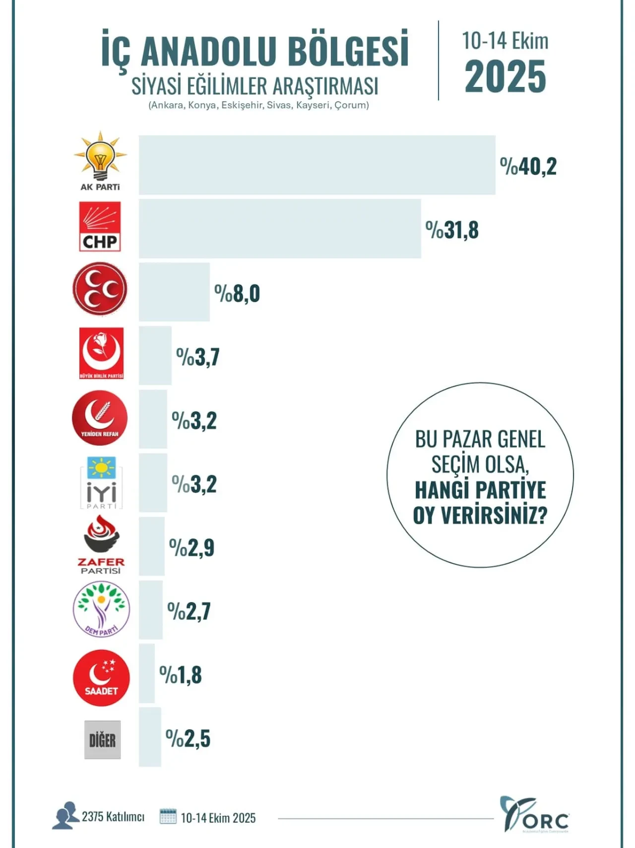 Gündemde seçim olmamasına karşın anket şirketleri yaptıkları araştırmaları kamuoyuyla paylaşmaya devam ediyor. ORC Araştırma da son seçim anketinin sonuçlarını kamuoyuyla paylaştı. 10-14 Ekim 2025 tarihleri arasında 2375 katılımcıyla İç Anadolu Bölgesi'nde yapılan ankette AK Parti yüzde 40 barajının üstüne çıkarak birinci parti oldu.