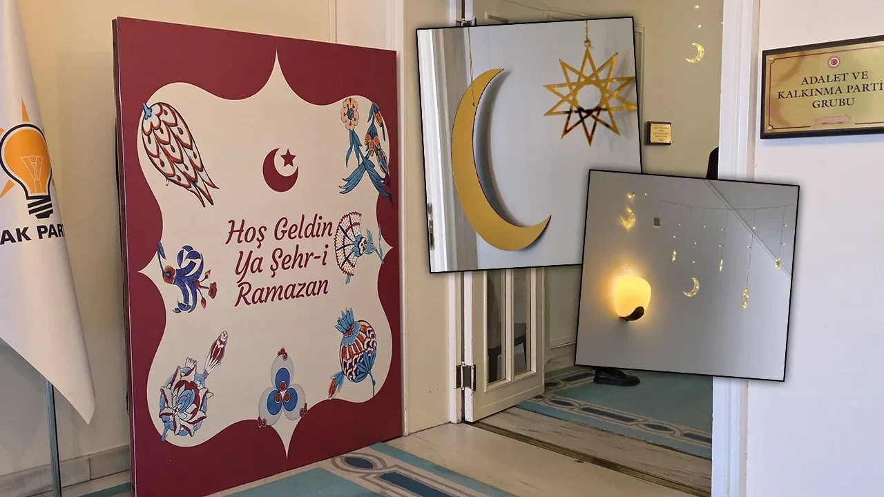 TGRT Haber Ankara Temsilcisi Fatih Atik, sosyal medya hesabından paylaştığı görüntülerde; TBMM AK Parti Grup Başkanlığı koridorları Ramazan ayının manevi iklimine uygun olarak özel ışıklı süslemeler, yazılarla donatıldığı görüldü.