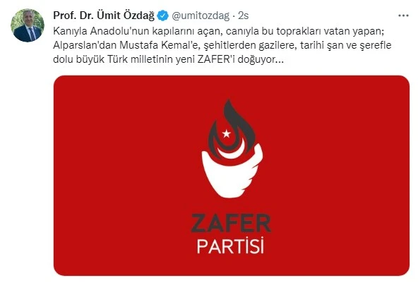 İYİ Parti'de Buğra Kavuncu ile yaşadığı tartışmaların ardından ihraç edilen ancak Ankara 1. Asliye Hukuk Mahkemesi tarafından ihraç kararının iptal edilmesiyle partiden kendi isteğiyle istifa eden Ümit Özdağ, yeni bir siyasi parti kurma sinyallerinin ardından partinin ismi ve logosunu açıkladı. Kişisel Twitter hesabı üzerinden yaptığı paylaşımda partinin adını 'Zafer Partisi' olarak duyuran Özdağ'ın kuruluş dilekçesini 26 Ağustos'ta vereceği öğrenildi.
