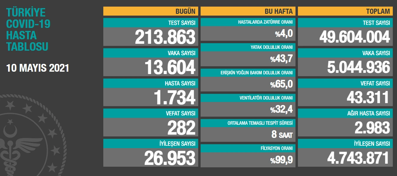 Ağır hasta sayısı 2 bin 983 oldu, 26 bin 953 kişinin Kovid-19 tedavisinin/karantinasının sona ermesiyle iyileşen sayısı 4 milyon 743 bin 871'e yükseldi.