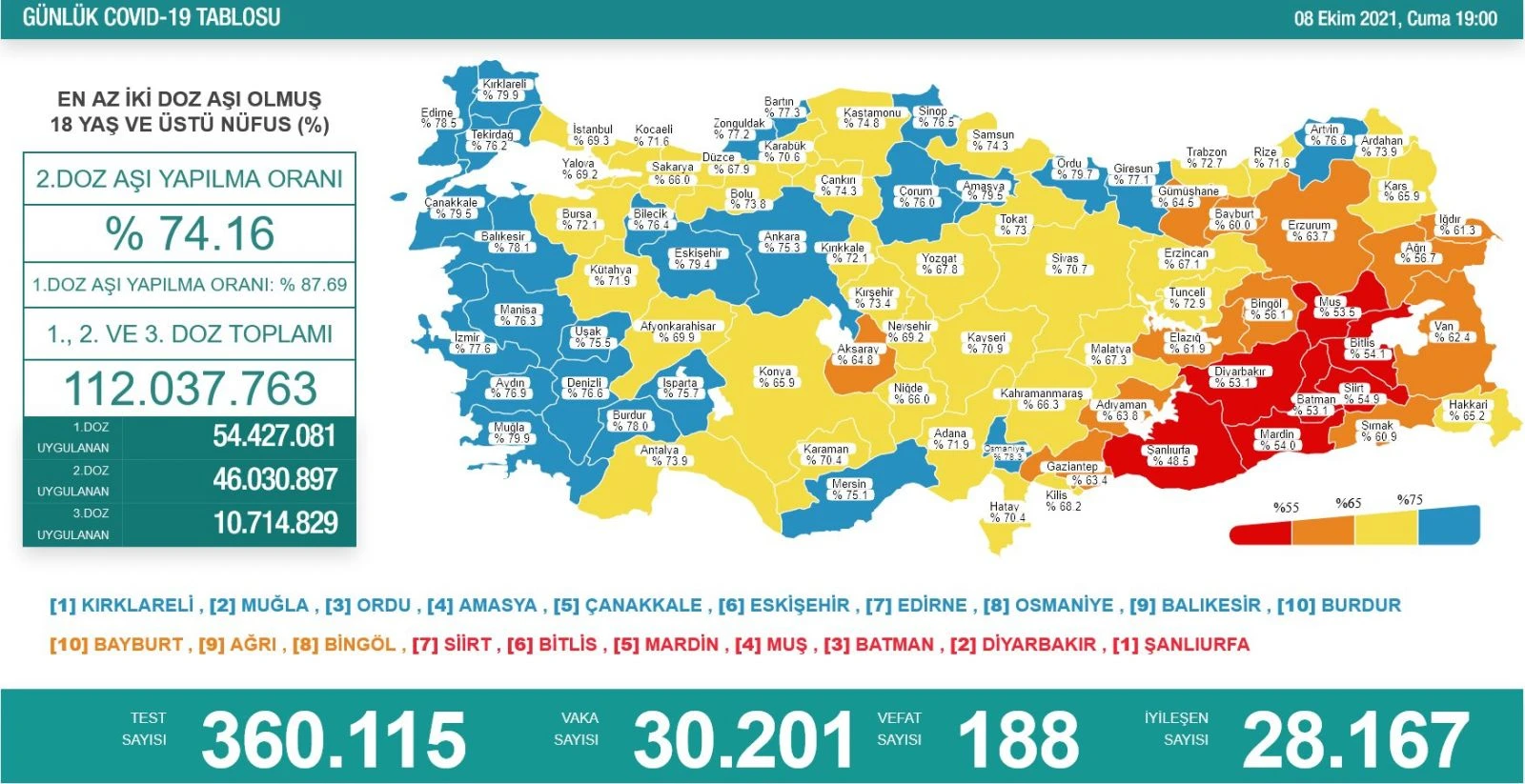 En az 2 doz aşısını olmuş 18 yaş üzeri nüfusu kapsayan verilere göre Türkiye'de 2. doz aşılama ortalama yüzde 74,16 oldu. 1. doz ortalaması yüzde 87,69 olurken, 1., 2. ve 3. doz aşısını olan vatandaş sayısı toplamda 112 milyon 37 bin 763’e yükseldi.