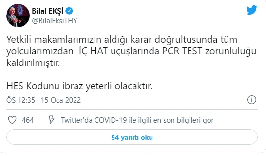 Öte yandan THY genel Müdür Bilal Ekşi, sosyal medya platformu Twitter'dan yaptığı açıklamda, tüm yolculara iç hat uçuşlarında uygulanan PCR test zorunluluğunun kaldırıldığını açıkladı.