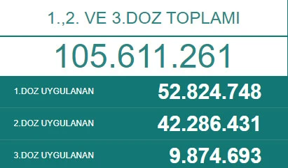 Türkiye'de 2 doz aşı yapılanların sayısı yüzde 68,13'ü geçti. Birinci doz aşılananların oranı ise yüzde 85,10. Toplam aşılama sayısı ise 105 milyon 611 bin 261'e ulaştı.
