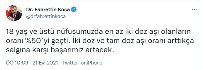 "18 yaş ve üstü nüfusumuzda en az iki doz aşı olanların oranı yüzde 50’yi geçti. İki doz ve tam doz aşı oranı arttıkça salgına karşı başarımız artacak."