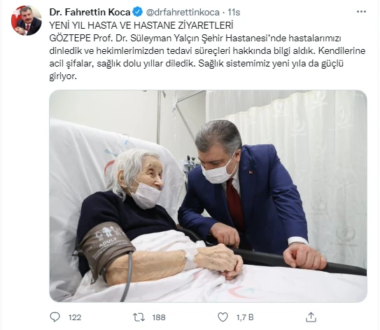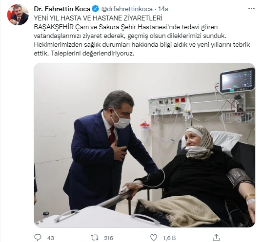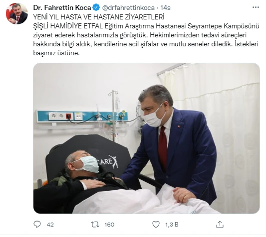 Hastaların sağlık durumları ile ilgili bilgi alan Bakan Koca, onlarla sohbet etti. Sosyal medya hesabından gerçekleştirdiği ziyaretlerden kareler paylaşan Koca, yeni yıla hastanede girmek zorunda kalan gençlere ve yaşlılara moral ve destek verirken, yeni yıllarını da kutladı.