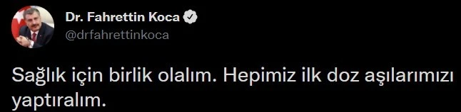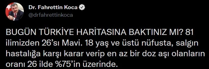“Bugün Türkiye haritasına baktınız mı? 81 ilimizden 26’sı Mavi. 18 yaş ve üstü nüfusta, salgın hastalığa karşı karar verip en az bir doz aşı olanların oranı 26 ilde yüzde 75’in üzerinde. Sağlık için birlik olalım. Hepimiz ilk doz aşılarımızı yaptıralım” ifadelerine yer verdi.
