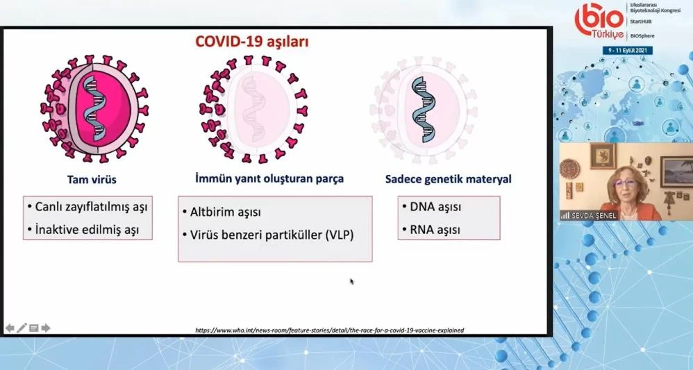 Biyolojik Biyoteknolojik Ürünler Aşılar, Aşı Üretim Teknolojisi ve Covid-19' adlı oturumda ise Prof. Dr. Sevda Şenel, aşı formülasyonları ve adjuvanlar (destekleyiciler) hakkında önemli bilgiler verdi. Prof. Dr. Şenel, "Aşı formülasyonundan bahsedersek, konvansiyonel bir aşı formülasyonu antijen içerir. Genel olarak konvansiyonel aşılarda antimikrobiyal koruyucular olabilir ancak daha önemlisi adjuvanlardır. Biz patojenleri ya canlı ya da ölü olarak kullanıyoruz. Canlı aşı kullandığımız zaman adjuvanlara gerek kalmıyor, bunlarda yan etki çok fazla görülüyor. Bu nedenle biz ya inaktive ederek kullanıyoruz ya da bu patojenlerin aktif olan kısımlarını alıyoruz" dedi.