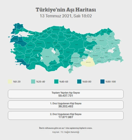 Türkiye'de birinci doz uygulanan aşı sayısı 37 milyon 960 bin 880, ikinci doz aşı sayısı 17 milyon 543 bin 398 oldu. Üçüncü doz ise 3 milyon 89 bin 859 olarak yer aldı.
