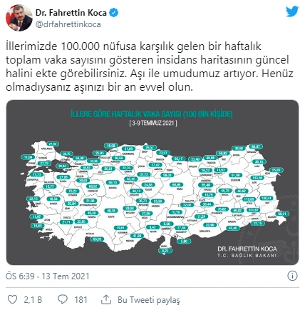 Sağlık Bakanı Fahrettin Koca, Twitter hesabından 3-9 Temmuz tarihleri arasındaki haftalık vaka haritasını paylaştı. Bakan Koca, yaptığı paylaşımda aşılama çalışmalarının önemine dikkat çekerek aşı olmanyam vatandaşlara aşı olmaları konusunda çağrıda bulundu.