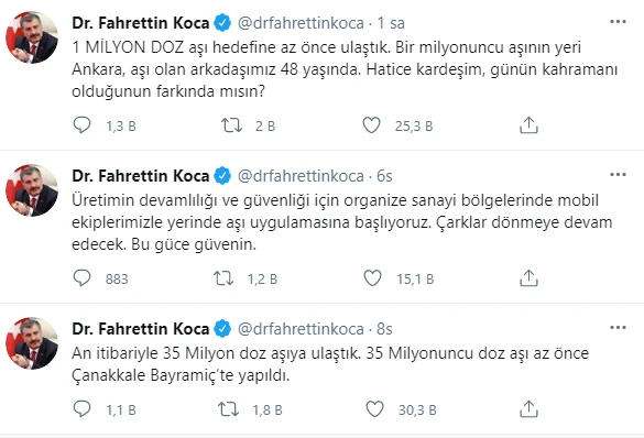 Sağlık Bakanı Fahrettin Koca, sosyal medya hesabından yaptığı paylaşımda, "1 milyon doz aşı hedefine az önce ulaştık. Bir milyonuncu aşının yeri Ankara, aşı olan arkadaşımız 48 yaşında. Hatice kardeşim, günün kahramanı olduğunun farkında mısın?" ifadelerini kullandı.