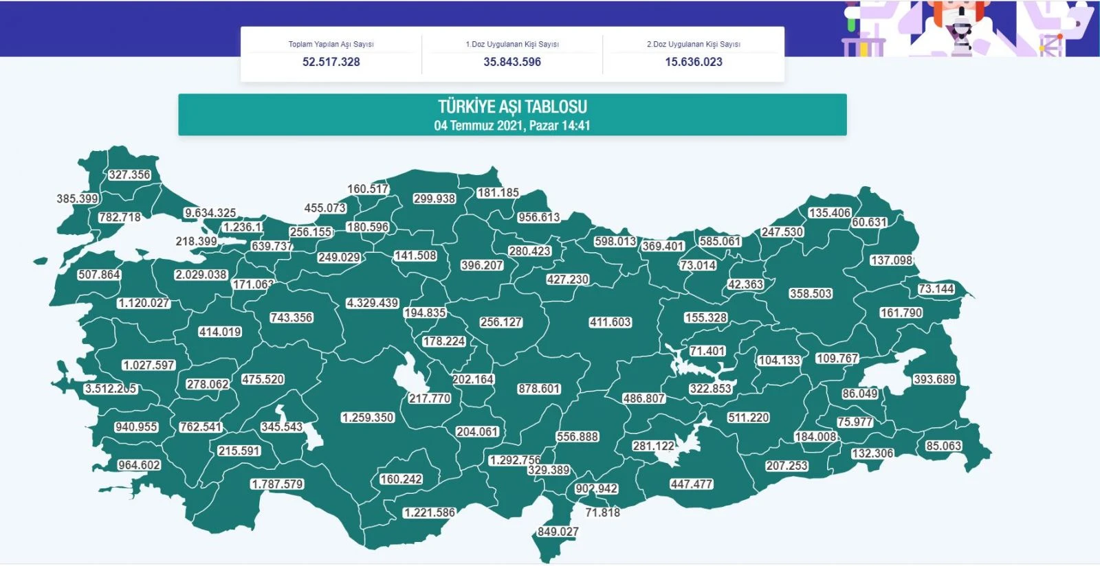 Türkiye’de 4 Temmuz itibariyle yapılan aşı sayısı 52 milyonu geçti. 1. Doz aşı olanların sayısı ise 36 milyona yaklaştı. 2. Doz aşı olanlar ise 15 milyondan fazla. Sağlık Bakanlığı'nın internet sitesinde sürekli güncellediği tabloda aşı sayısı görüntülenebiliyor. Ancak tabloya dikkatli bakıldığında, toplam aşı sayısının 1. ve 2. doz aşı olanların toplamından fazla olduğu görülüyor. Toplam yapılan aşı sayısı 52.milyon 527 bin 240 olarak görülüyor. 1. ve 2. doz aşının toplamı ise 51 milyon 486 bin 227. Aradaki fark ise 1 milyon 41 bin 13. Yani toplam aşı sayısı fazla veriyor. Bu farkın geçen hafta sağlık çalışanlarına yapılan 3. doz aşıdan kaynakladığı tahmin ediliyor.