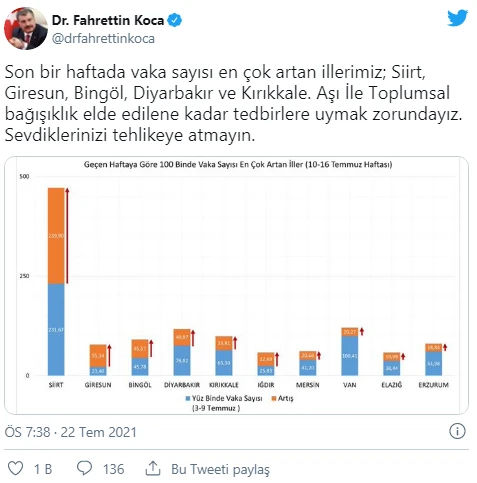 Sağlık Bakanlığı, Türkiye’nin haftalık koronavirüs tablosunu paylaştı. 10-16 Temmuz illlere göre haftalık vaka tablosunda en çok vaka sayısı artan iller; Siirt, Giresun, Bingöl, Diyarbakır ve Kırıkkale. olarak açıklandı.