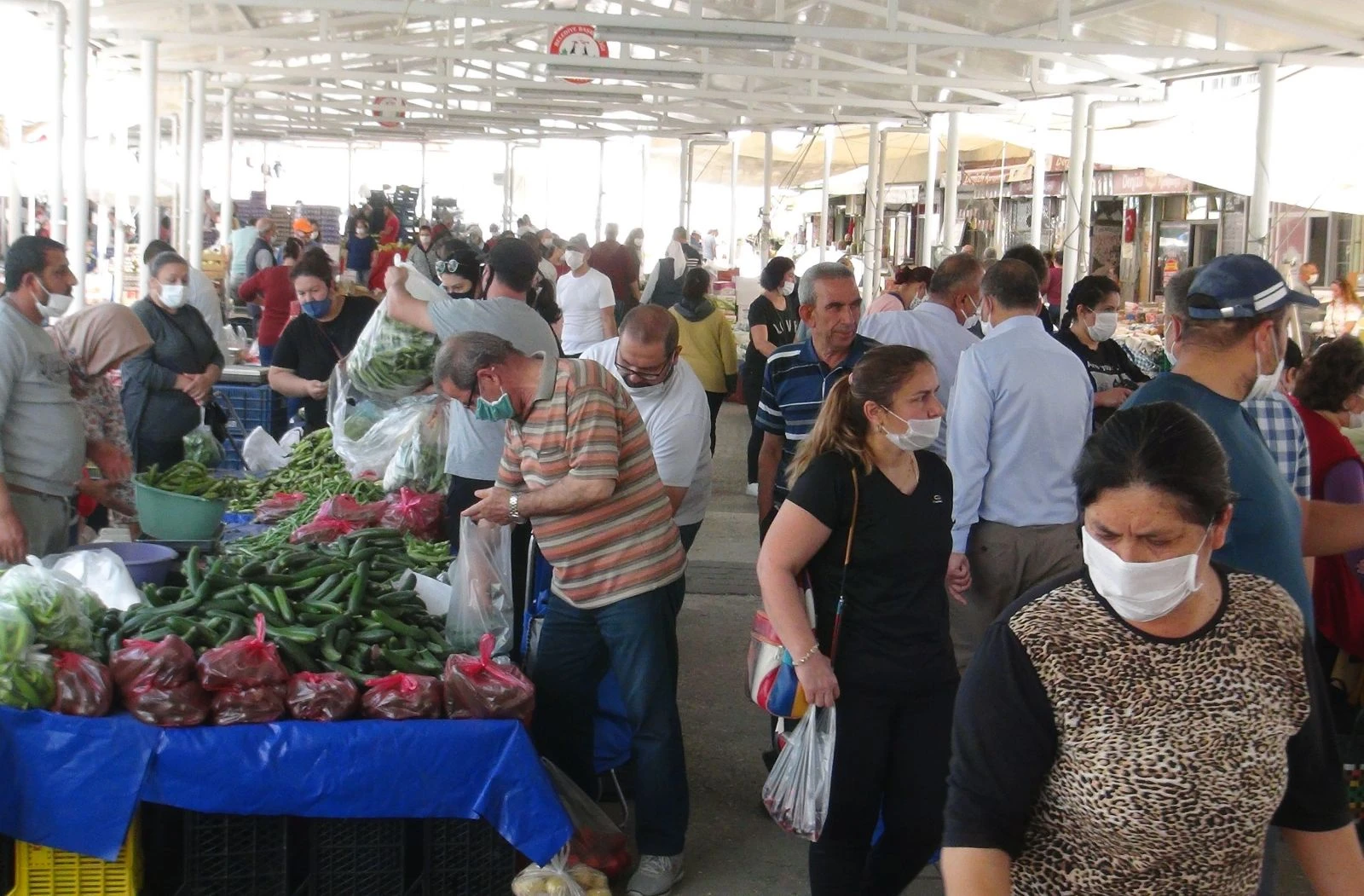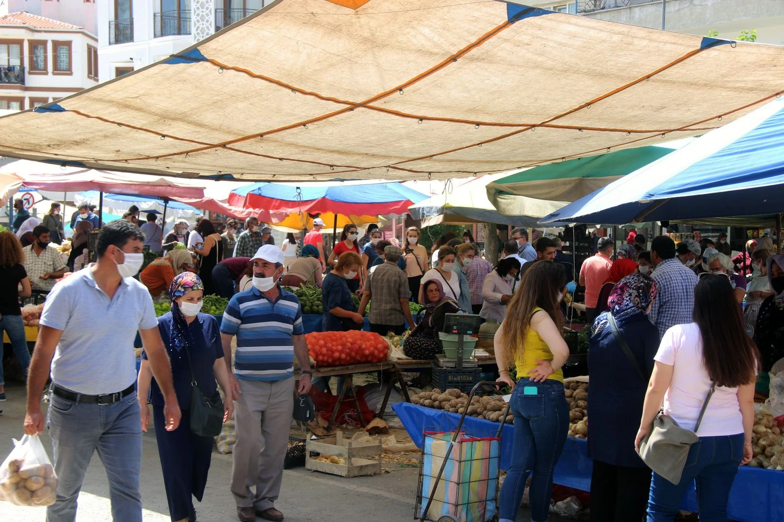 Perşembe günleri kurulan ve bölgenin en büyük halk pazarında vatandaşlar çoğu zaman sosyal mesafe kurularına uymayarak tezgah başında kalabalık gruplar oluşturdu. Bazı vatandaşlar ise 65 yaş üstünün sokağa çıkmasının yasak olmasına rağmen, pazarda 65 yaş üstü çok sayıda vatandaşın alışveriş yaptığını ileri sürdü.