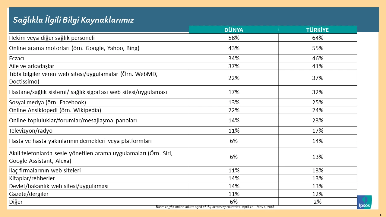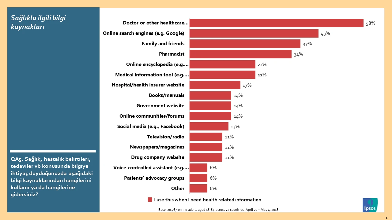 Bireylerin sağlıklarıyla ilgili algılarını ve pratiklerini ortaya koymak üzere Ipsos’un Türkiye dahil 28 ülkede gerçekleştirdiği geniş kapsamlı araştırma; hastalıklarla ilgili bireylerin hangi bilgi kaynaklarına başvurduklarını da belirledi. Buna göre hastalık söz konusu olduğunda hekim veya diğer sağlık personeline danışmak her ne kadar ilk tercihimiz olsa da(%58), Google gibi online arama motorlarını kullanmaktan da vazgeçemiyoruz gözüküyor. (%43).