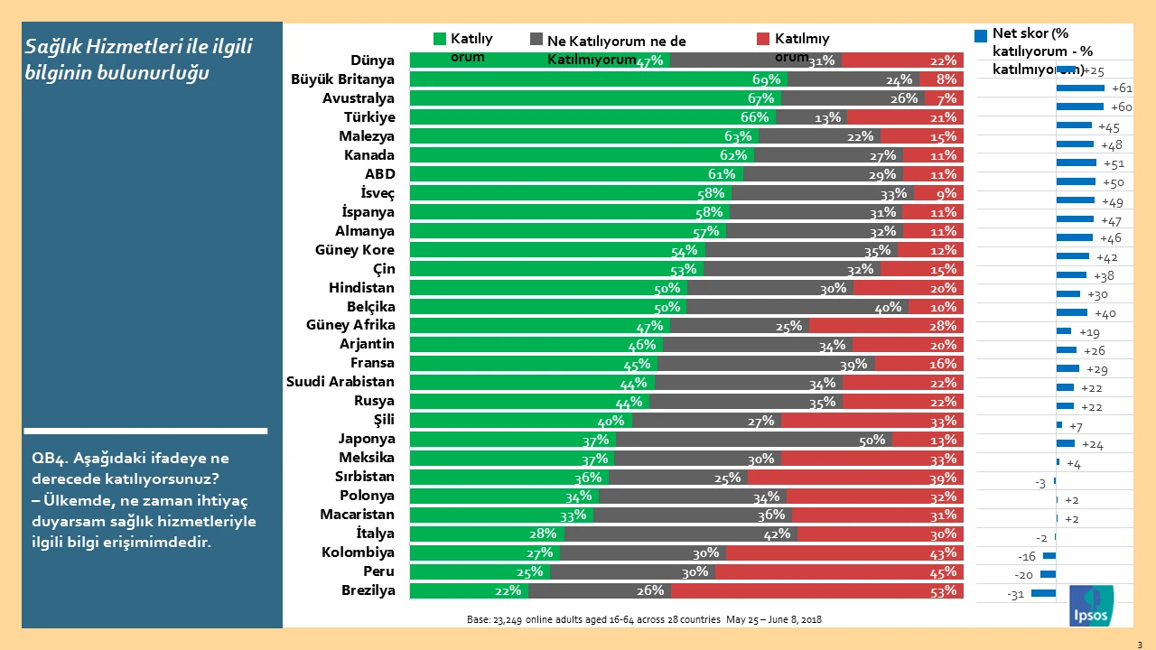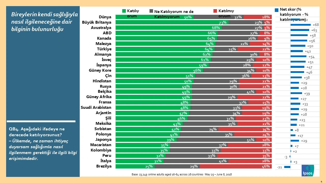 Bireylerin kendi sağlığıyla nasıl ilgileneceğine dair bilginin bulunurluğu konusunda da en yüksek olumlu yanıt İngiltere’den gelirken; araştırmaya Türkiye’den katılan bireylerin de %64’ü bu konuda olumlu yanıt verdi. Genel olarak sağlık konusundaki bilgiye erişime dair olumlu bir çizgi görüldü.