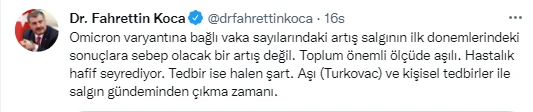 Sağlık Bakanı Fahrettin Koca, sosyal paylaşım sitesi Twitter hesabından yaptığı paylaşımda “Omicron varyantına bağlı vaka sayılarındaki artış salgının ilk dönemlerindeki sonuçlara sebep olacak bir artış değil. Toplum önemli ölçüde aşılı. Hastalık hafif seyrediyor. Tedbir ise halen şart. Turkovac aşı ve kişisel tedbirler ile salgın gündeminden çıkma zamanı” dedi.