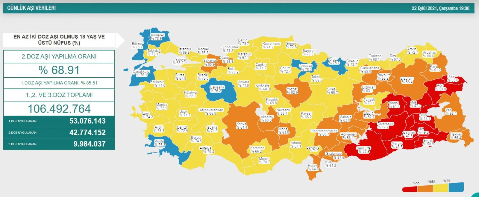 En az iki doz aşı yapılanların oranının en düşük olduğu iller ise Şanlıurfa, Mardin, Bitlis, Batman, Muş, Diyarbakır, Siirt, Şırnak, Ağrı ve Bingöl olarak sıralandı.