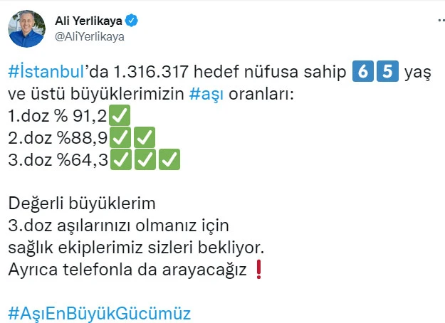 Yerlikaya, "1. doz yüzde 91,2, 2. doz yüzde 88,9, 3. doz yüzde 64,3. Değerli büyüklerim 3. doz aşılarınızı olmanız için sağlık ekiplerimiz sizleri bekliyor. Ayrıca telefonla da arayacağız." ifadelerini kullandı.
