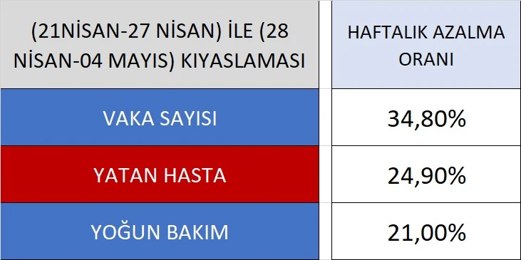 Memişoğlu, "21-27 Nisan ile 28 Nisan-4 Mayıs Kıyaslaması" başlığıyla paylaştığı tabloda, vaka sayısında yüzde 34,80, yatan hasta sayısında yüzde 24,90, yoğun bakımda tedavi gören hasta sayısında ise yüzde 21,00 oranında haftalık azalma olduğunu kaydetti.