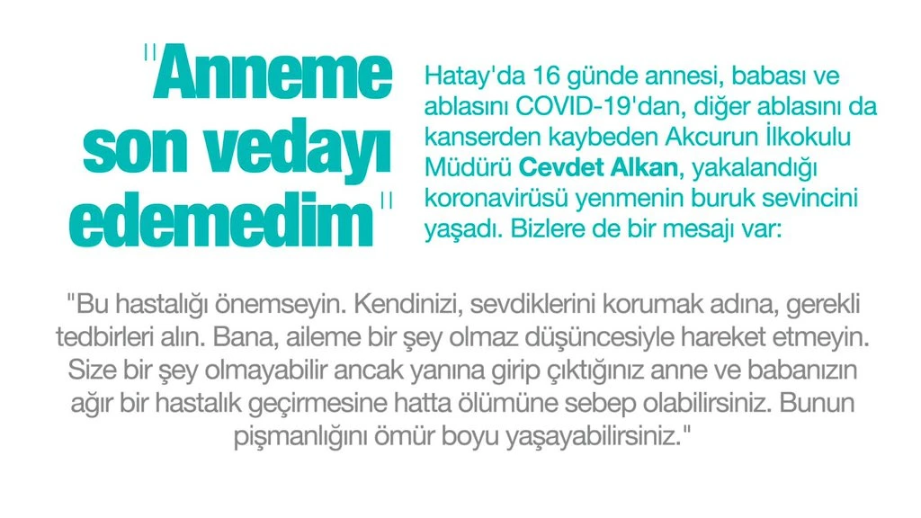 Sağlık Bakanı Fahrettin Koca, Twitter hesabından, Hatay'da 16 günde annesi, babası ve ablasını Kovid-19'dan, diğer ablasını da kanserden kaybeden ve Kovid-19'u yenen Akcurun İlkokulu Müdürü Cevdet Alkan'ın mesajını paylaştı.