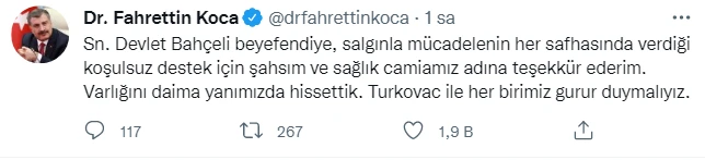 Diğar bir paylaşımında ise MHP Lideri Devlet Bahçeli'nin hatırlatma dozu aşısını yerli ve milli koronavirüs aşısı Turkovac ile olduğu için teşekkür eden Bakan Koca, Devlet Bahçeli beyefendiye, salgınla mücadelenin her safhasında verdiği koşulsuz destek için şahsım ve sağlık camiamız adına teşekkür ederim. Varlığını daima yanımızda hissettik. Turkovac ile her birimiz gurur duymalıyız" ifadelerini kullandı.