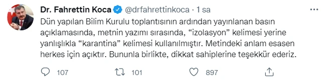 Öte yandan dün gerçekleştirilen Bilim Kurulu toplantısının ardından açıklanan yazılı açıklamada, 'izolasyon' kelimesi yerine yanlışlıkla 'karantina' kelimesi kullanıldığını belirten Bakan Koca, "Metindeki anlam esasen herkes için açıktır. Bununla birlikte, dikkat sahiplerine teşekkür ederiz" ifadelerini kullandı.
