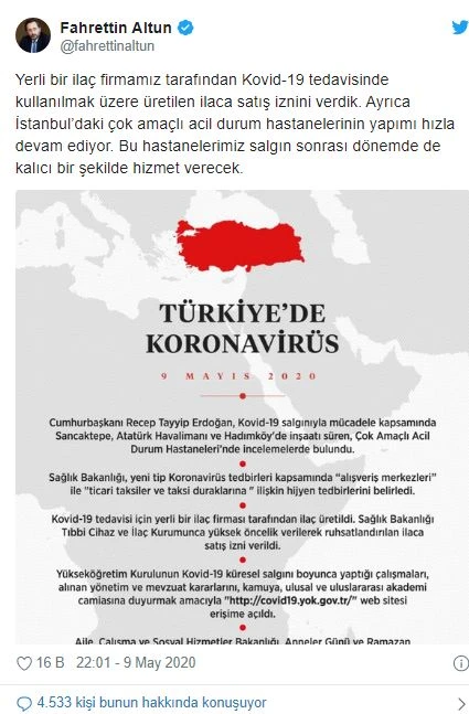 Altun, Twitter hesabından yaptığı paylaşımda, "Yerli bir ilaç firmamız tarafından Kovid-19 tedavisinde kullanılmak üzere üretilen ilaca satış iznini verdik. Ayrıca İstanbul’daki çok amaçlı acil durum hastanelerinin yapımı hızla devam ediyor. Bu hastanelerimiz salgın sonrası dönemde de kalıcı bir şekilde hizmet verecek" açıklamasında bulundu.