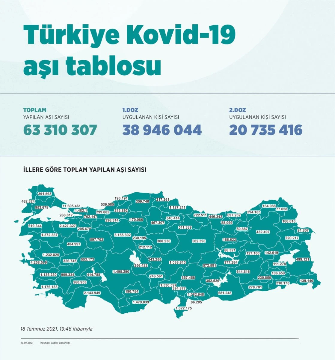 Sağlık Bakanlığının "covid19asi.saglik.gov.tr" adresinde yer alan anlık verilere göre, 18 Temmuz saat 19.45 itibarıyla ülke genelinde uygulanan toplam doz miktarı 63 milyon 310 bin 307 oldu.