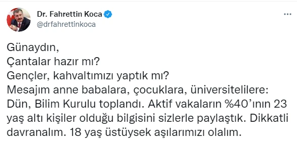 "Günaydın, Çantalar hazır mı? Gençler, kahvaltımızı yaptık mı? Mesajım anne babalara, çocuklara, üniversitelilere: Dün, Bilim Kurulu toplandı. Aktif vakaların yüzde 40'ının 23 yaş altı kişiler olduğu bilgisini sizlerle paylaştık. Dikkatli davranalım. 18 yaş üstüysek aşılarımızı olalım" ifadelerini kullandı.