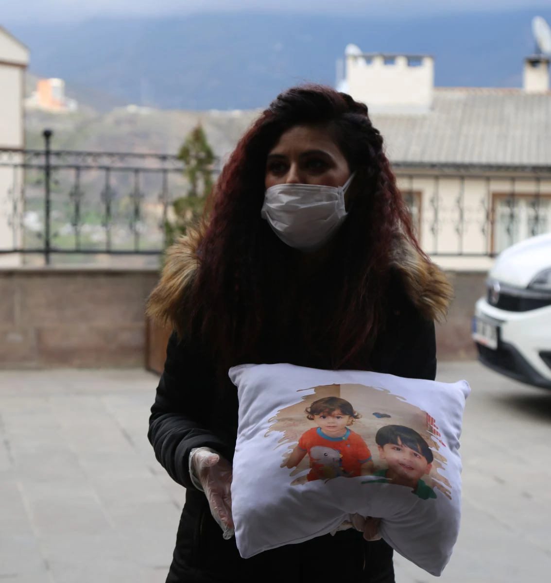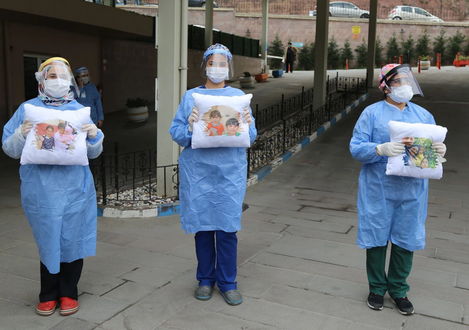Artvin Devlet Hastanesinde görev yapan sağlık çalışanlarını acil servis kapısında ziyaret eden Büşra Keleş, çocuklarının fotoğrafı baskılı yastıkları hediye etti.