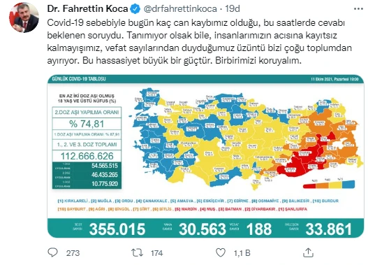 Sağlık Bakanı Koca, sosyal paylaşım sitesi Twitter hesabından yaptığı paylaşımda, "Covid-19 sebebiyle bugün kaç can kaybımız olduğu, bu saatlerde cevabı beklenen soruydu. Tanımıyor olsak bile insanlarımızın acısına kayıtsız kalmayışımız, vefat sayılarından duyduğumuz üzüntü bizi çoğu toplumdan ayırıyor. Bu hassasiyet büyük bir güçtür. Birbirimizi koruyalım” dedi.