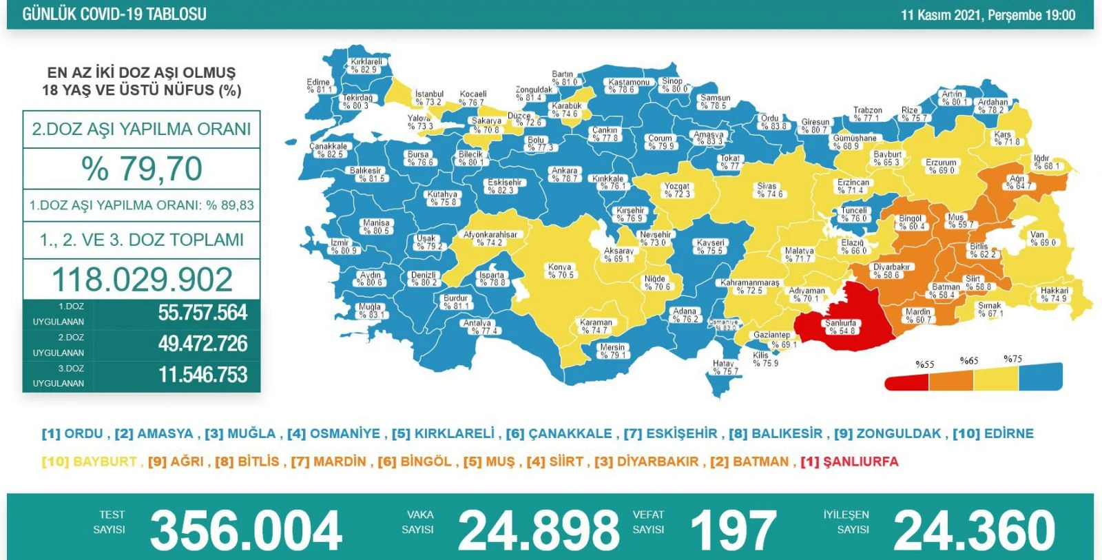 Bakanlığın tablosuna göre yüzde 55 ile Türkiye'de en az aşılamanın gerçekleştirildiği Şanlıurfa’yı, Batman, Diyarbakır, Siirt, Muş, Bingöl, Mardin, Bitlis, Ağrı ve Bayburt takip etti.