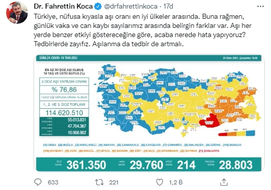 Sağlık Bakanı Koca, sosyal paylaşım sitesi Twitter hesabından yaptığı paylaşımda, “Türkiye, nüfusa kıyasla aşı oranı en iyi ülkeler arasında. Buna rağmen, günlük vaka ve can kaybı sayılarımız arasında belirgin farklar var. Aşı her yerde benzer etkiyi göstereceğine göre, acaba nerede hata yapıyoruz? Tedbirlerde zayıfız. Aşılanma da tedbir de artmalı” dedi.
