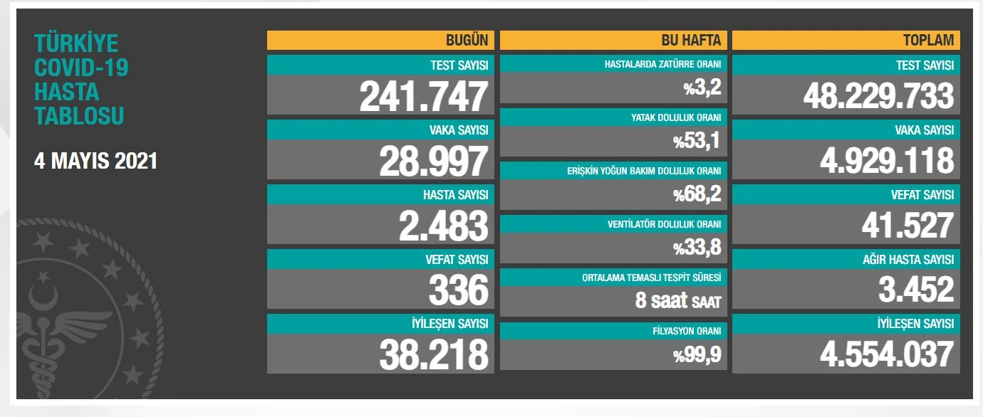 Türkiye tam kapanma sürecine geçtiğimiz günlerde Cumhurbaşkanı Erdoğan'ın açıklaması ile girmişti. Tam kapanma ile birlikte Türkiye'de vaka sayılarında azalma devam ediyor. Türkiye'de son 24 saatte 241 bin 747 Kovid-19 testi yapıldı, 28 bin 997 kişinin testi pozitif çıktı, 336 kişi hayatını kaybetti. Ağır hasta sayısı 3 bin 452 oldu, 38 bin 218 kişinin Kovid-19 tedavisinin/karantinasının sona ermesiyle iyileşen sayısı 4 milyon 554 bin 37'ye yükseldi.