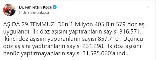 İlk doz aşısını yaptıranların sayısının 316 bin 571, ikinci doz aşısını yaptıranların sayısının 857 bin 710, üçüncü doz aşısını yaptıranların sayısının ise 231 bin 298 olduğunu belirten Bakan Koca, "İlk doz aşısını henüz yaptırmayanların sayısı 21 milyon 585 bin 60'a indi" ifadesini kullandı.
