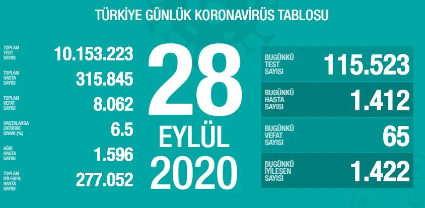 Sağlık Bakanlığının Covid-19 bilgilendirme sayfasında Türkiye’nin güncel korona virüs tablosu kamuoyuyla paylaşıldı. Tabloya göre son 24 saatte 65 kişi korona virüsten hayatını kaybetti, toplam can kaybı 8 bin 62’e yükseldi. Bugün toplam 115 bin 523 test yapılırken, bin 412 yeni vaka tanısı konuldu. Toplam vaka sayısı ise 315 bin 845 oldu. Bugün iyileşen bin 422 kişiyle birlikte toplam iyileşen toplam hasta sayısı 277 bin 52'e yükseldi. Toplam hastalarda zatürre oranının yüzde 6,5, toplam ağır hasta sayısının ise bin 596 olduğu açıklandı.