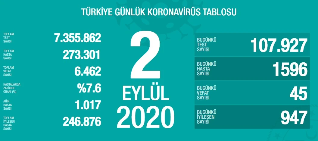 Sağlık Bakanı Fahrettin Koca, sosyal medya hesabından yaptığı paylaşımla Türkiye’nin güncel korona virüs tablosunu kamuoyu ile paylaştı. Tabloya göre son 24 saatte 45 kişi korona virüsten hayatını kaybetti, toplam can kaybı 6 bin 462’e yükseldi. Bugün toplam 107 bin 927 test yapılırken, bin 596 yeni vaka tanısı konuldu. Toplam vaka sayısı 273 bin 301 oldu. Bugün iyileşen 947 kişiyle birlikte toplam iyileşen toplam hasta sayısı da 246 bin 876'a yükseldi. Toplam hastalarda zatürre oranının yüzde 7,6, toplam ağır hasta sayısının ise bin 17 olduğu açıklandı.