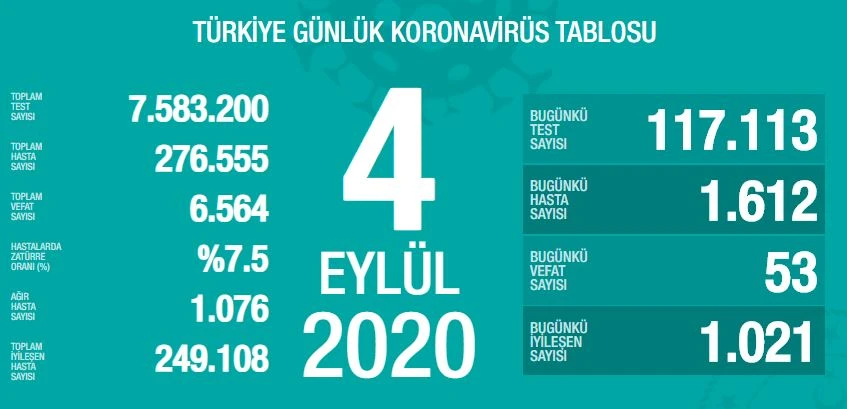 Sağlık Bakanlığının Covid-19 bilgilendirme sayfasında Türkiye’nin güncel korona virüs tablosu kamuoyuyla paylaşıldı. Tabloya göre son 24 saatte 53 kişi korona virüsten hayatını kaybetti, toplam can kaybı 6 bin 564’e yükseldi. Bugün toplam 117 bin 113 test yapılırken, bin 612 yeni vaka tanısı konuldu. Toplam vaka sayısı 276 bin 555 oldu. Bugün iyileşen bin 21 kişiyle birlikte toplam iyileşen toplam hasta sayısı 249 bin 108'e yükseldi. Toplam hastalarda zatürre oranının yüzde 7,5, toplam ağır hasta sayısının ise bin 76 olduğu açıklandı.