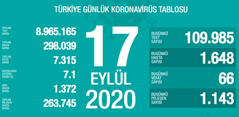 Sağlık Bakanlığının Covid-19 bilgilendirme sayfasında Türkiye’nin güncel korona virüs tablosu kamuoyuyla paylaşıldı. Tabloya göre son 24 saatte 66 kişi korona virüsten hayatını kaybetti, toplam can kaybı 7 bin 315’e yükseldi. Bugün toplam 109 bin 985 test yapılırken, bin 648 yeni vaka tanısı konuldu. Toplam vaka sayısı 298 bin 039 oldu. Bugün iyileşen bin 143 kişiyle birlikte toplam iyileşen toplam hasta sayısı 263 bin 745'e yükseldi. Toplam hastalarda zatürre oranının yüzde 7,1, toplam ağır hasta sayısının ise bin 372 olduğu açıklandı.
