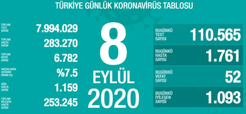 Sağlık Bakanlığının Covid-19 bilgilendirme sayfasında Türkiye’nin güncel korona virüs tablosu kamuoyuyla paylaşıldı. Tabloya göre son 24 saatte 52 kişi korona virüsten hayatını kaybetti, toplam can kaybı 6 bin 782’e yükseldi. Bugün toplam 110 bin 565 test yapılırken, bin 761 yeni vaka tanısı konuldu. Toplam vaka sayısı 283 bin 270 oldu. Bugün iyileşen bin 93 kişiyle birlikte toplam iyileşen toplam hasta sayısı 253 bin 245'e yükseldi. Toplam hastalarda zatürre oranının yüzde 7,5, toplam ağır hasta sayısının ise bin 159 olduğu açıklandı.